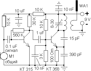 Номиналы деталей некритичны и могут отличаться в ту или иную сторону в полтора раза. H Радиус действия 300м. Чувствительность по НЧ позволяет прослушивать громкий разговор в комнате. Если же тракт НЧ дополнить еще одним каскадом усиления, то становится слышим даже тихий шепот...Правда, от громкой речи схема тогда перегружается и бы надо еще ставить АРУ.Если же вам требуется передатчик - радиомикрофон (когда вы планируете непосредственно бубнить прямо в микрофонный капсюль), то каскад усиления НЧ вообще не нужен.