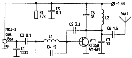 Предлагаемый радиомикрофон питается от одной батарейки. Дальность действия составляет 100...200 м в условиях прямой видимости. Ток потребления при питании 1,5В составляет 5...10 мА. При увеличении питания до 9 В увеличивается выходная мощность, при этом нужно поставить дополнительный резистор (в пределах 20 к) между синим проводом микрофона и плюсовым источником питания. Катушки L1 и L2 намотаны на оправке диаметром 4 мм и имеют 8 и 6 витков соответственно (намотка - виток к витку).