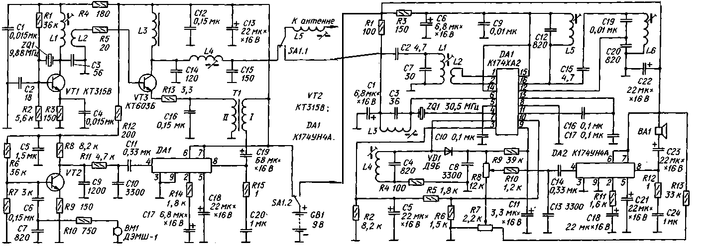 При налаживании передатчика подстроечником катушки L1 добиваются устойчивого возбуждения кварцевого резонатора задающего генератора на третьей гармонике. Затем последовательной подстройкой катушек L4 и L5 добиваются максимальной излучаемой мощности (контролируют по внешнему индикатору поля). После этого проверяют модуляцию. Если при этом наблюдается перемодуляция, уменьшают усиление каскада на транзисторе VT2 (устанавливают резистор R9 с большим номиналом). И, наоборот, если модуляция "мелковата", то устанавливают этот резистор с меньшим номиналом. Налаживание приемника сводится к аналогичным процедурам. Сначала добиваются подстройкой катушки L3 устойчивой работы гетеродина, а затем подстройкой катушек L1 и L4≈L6 ≈ максимальной чувствительности приемника.
