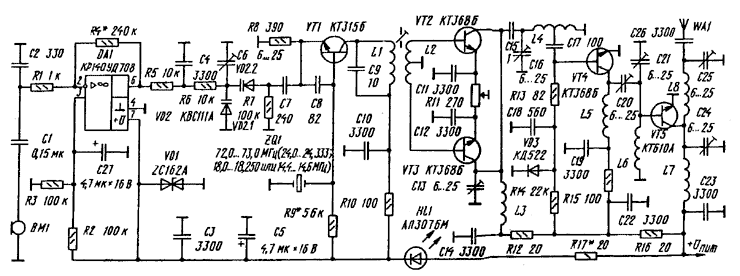 Структурная схема передатчика приведена на Рис.1. Сигнал с микрофона поступает на усилитель А1 и с него на модулируемый генератор G1 с кварцевой стабилизацией частоты. Третья, четвёртая или пятая гармоника ЧМ сигнала (в зависимости от частоты применённого кварцевого резонатора) поступает на удвоитель частоты U1. Преобразованный сигнал в пределах двухметрового любительского диапазона усиливается двухкаскадным усилителем и поступает в антенну. На Рис.2 приведена принципиальная схема передатчика. Сигнал с микрофона ВМ1 через разделительный конденсатор С1 и резистор R1, заваливающие нижние частоты ЗЧ диапазона, подаётся на операционный усилитель (ОУ) DA1 и усиливается им. Конденсатор С2 защищает вход усилителя от РЧ наводок. Резистор R4 в цепи отрицательной обратной связи ОУ определяет его усиление. Резисторами R2,R3 балансируют ОУ по постоянному току и, одновременно с этим, устанавливают рабочую точку на характеристике изменения ёмкости варикапной матрицы, связанной с ОУ по постоянному току через резисторы фильтра нижних частот (ФНЧ) R5C4R6. Напряжение на варикапах пульсирует в такт с частотой звукового сигнала. Их ёмкость включена последовательно в емкостной делитель в цепи обратной связи кварцевого генератора и, следовательно, при возбуждении последнего, его частота также будет изменяться в такт со звуковым сигналом. Задающий генератор выполнен на транзисторе VT1. Кварцевый резонатор ZQ1 включен в цепь базы и возбуждается на частоте параллельного резонанса. Контур L1C9 в коллекторной цепи транзистора выделяет напряжение с частотой в диапазоне 72:73 МГц. С катушкой этого контура индуктивно связан вход парафазного балансного умножителя частоты(в данном случае, удвоителя частоты), работающего на чётных гармониках. Полосовой фильтр (ПФ) L3C13C15L4C16 выделяет напряжение частотой 144:146 МГц (в зависимости от частоты кварцевого резонатора ZQ1), которое с части витков катушки L4, через разделительный конденсатор, поступает на вход первого каскада усилителя, выполненного на транзисторе VT4. Он работает в режиме класса АВ с небольшим начальным смещением, получаемом на параметрическом стабилизаторе напряжения - кремниевом диоде VD3, включенном в прямом направлении прохождения тока. Усиленное и отфильтрованное (ПФ L5C20L6C21) напряжение поступает на оконечный усилитель мощности, собранный на транзисторе VT5. Каких - либо особенностей каскад не имеет, работает в классе С. Усиленное напряжение РЧ (здесь лучше говорить уже о токе или мощности) через фильтр нижних частот, подавляющий высшие гармоники и согласующий каскад с нагрузкой, подаётся в антенну WA1. Конденсатор С26 - разделительный. Микрофонный усилитель и кварцевый генератор питаются от параметрического стабилизатора напряжения, выполненного на стабилитроне VD1. Светодиод HL1, включенный последовательно со стабилитроном, индицирует включение передатчика. RC-фильтры R10C10, R12C14, R16C22, а также R14C18 и конденсаторы С3, С5 и С23 повышают устойчивость работы передатчика, развязывая его каскады по питанию. Антенной передатчика может служить четвертьволновый вибратор, штыревая антенна с укорачивающей катушкой, спиральная. В стационарных условиях приемлем весь арсенал антенн: от GP до многоэлементных и многоярусных. Автор испытывал передатчик с антеннами: GP и 16-элементной F9FT. Передатчик выполнен на плате из двухсторонне