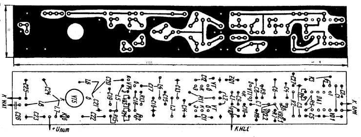 При напряжении 8 В и следует настраивать передатчик, этим будет обеспечена минимальная зависимость параметров передатчика от напряжения питания и компромисс, в смысле экономичности. Дело в том, что с повышением напряжения питания увеличивается потребляемый передатчиком ток, не только из-за увеличивающейся мощности раскачки оконечного каскада, но и из-за увеличения тока стабилизации VD1, для увеличения экономичности передатчика полезно этот ток снижать, но тогда есть риск выскочить за нижнюю границу тока стабилизации стабилитрона при снижении напряжения питания, при разрядке батареи. К выходу передатчика подключают эквивалент: два резистора МЛТ-0,5 сопротивлением 100 Ом, соединённых параллельно. От общего провода (при выключенном питании !) отпаивают вывод стабилитрона VD1 и последовательно с ним включают миллиамперметр с током полного отклонения стрелки 30:60 мА. Затем включают питание передатчика. Варьируя напряжением питания от максимального до минимального допустимых, подбором сопротивления резистора R17, добиваются, чтобы при крайних допустимых значениях напряжения питания стабилитрон не выходил из режима стабилизации (минимальный ток стабилизации для КС162А - 3 мА, максимальный - 22 мА). После этого, выключив питание, восстанавливают соединение. При правильном монтаже и исправных деталях налаживание передатчика продолжают настройкой контуров, используя для контроля резонансный волномер. Вначале вращением подстроечного ферритового сердечника катушки L1 добиваются максимального значения напряжения частотой 72:73 МГц (в зависимости от частоты кварцевого резонатора) в контуре L1C9. Затем последовательно настраивают контурыL3C13, L4C16, полосовой фильтр и фильтр нижних частот по максимуму напряжения частотой 144:146 МГц. Если, при этом, какой-либо подстроечный конденсатор находится в положении максимальной или минимальной ёмкости, то следует в соответствующей контурной катушке, соответственно, сжать или раздвинуть витки с помощью, например, стеклотекстолитовой пластинки (диэлектриком). Резкие изменения показаний волномера, отклонение стрелки измерительной головки в нём, даже при замыкании кварцевого резонатора накоротко или (и) расстройке волномера по частоте от рабочей передатчика, возникающие посторонние призвуки при прослушивании сигнала передатчика на приёмнике свидетельствуют о паразитном самовозбуждении передатчика. Если таковое возникнет, следует опустить монтируемые компоненты как можно ниже к "земляной" фольге платы, укоротить до необходимого минимума выводы всех конденсаторов, установив развязывающие в качестве экранов (под прямым углом к плоскости монтажной платы, не кладя их горизонтально). Может оказать влияние на стабильную работу передатчика и пониженное качество конденсаторов: трещины на них, утечки диэлектрика, применение низкочастотных типов конденсаторов, их большие габариты. После настройки контуров, подбирают сопротивление резистора R9 в кварцевом генераторе, также ориентируясь на максимальное выходное напряжение передатчика, затем балансируют подстроечным резистором R11 удвоитель частоты по наилучшему подавлению на его выходе частоты в районе 72:73 МГц (зависит от применённого кварцевого резонатора). Наличие гармоник и их абсолютный и относительный уровень удобно наблюдать на экране анализ