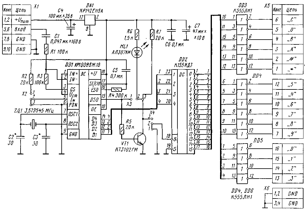 В описываемой конструкции применена типовая схема включения. По данньм [2] микросхема КР1008ВЖ18 не является полным аналогом прототипа MV8870. У последней имеются два варианта таблицы кодировки, которые могут быть выбраны в зависимости от логического уровня на входе 5. В данной конструкции эта возможность обеспечивается перемычкой Х2. Микросхемы КР1008ВЖ18 и НМ9270 имеют только один вариант таблицы, в котором тональная комбинация, соответствующая цифре "0", дает двоичную комбинацию 10102=10. При этом перемычка Х2 должна быть установлена в положение "2-3" (на выводе 5 микросхемы DD1- низкий уровень).