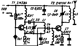 Простой двухтранзисторный передатчик (см. рисунок) предназначен для работы в диапазоне 144 МГц. Его можно использовать как возбудитель в более мощных передатчиках или как генератор при налаживании радиоприемника.