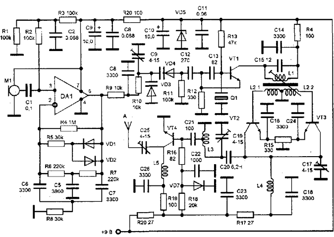Принципиальная схема передатчика показана на рисунке. В данной схеме используется модулирующий усилитель с электретным микpофоном со встpоенныс усилителем. С целью повышения pазбоpчивости речи применяется частотная и амплитудная коррекция низкочастотного сигнала. Сигнал от микрофона поступает на неинвертирующий вход операционного усилителя DA1. В данной схеме используется однополярное питание. Для того чтобы операционный усилитель мог работать, на этот его вход поступает напряжение смещения, равное половине напряжения питания, создавая среднюю точку двуполярного источника. Напряжение задается резисторами R1, R2, R3.