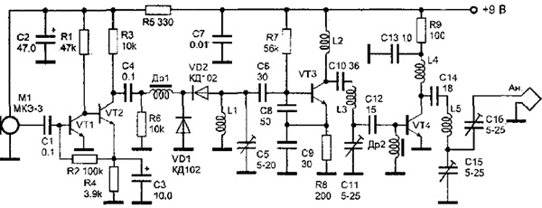 Низкочастотный сигнал микрофона М1 типа МКЭ-3, "Сосна" и др. усиливается двухкаскадным усилителем низкой частоты с непосредст- венными связями. Усилитель выполнен на транзисторах VT1 и VT2 типа КТ315. Режим работы усилителя устанавливается резистором R2. Задающий генератор устройства выполнен на транзисторе VT3 типа КТ315. Частотозадающий контур подключается к базе транзистора VT3 через конденсатор С6 небольшой емкости. Конденсаторы С8, С9 образуют цепь обратной связи. Контур генератоа состоит из индуктивности L1, конденсатора С5 и двух, включенных встречно, диодов типа КД102. Под действием модулирующего напряжения емкости диодов VD1, VK2 изменяются. Таким образом, осуществляется частотная модуляция передатчика. С выхода генератора модулированный .сигнал подается на усилитель мощности. Выходной усилитель выполнен на транзисторе VT4 типа КТ315. Он работает с высоким КПД в режиме класса "С".