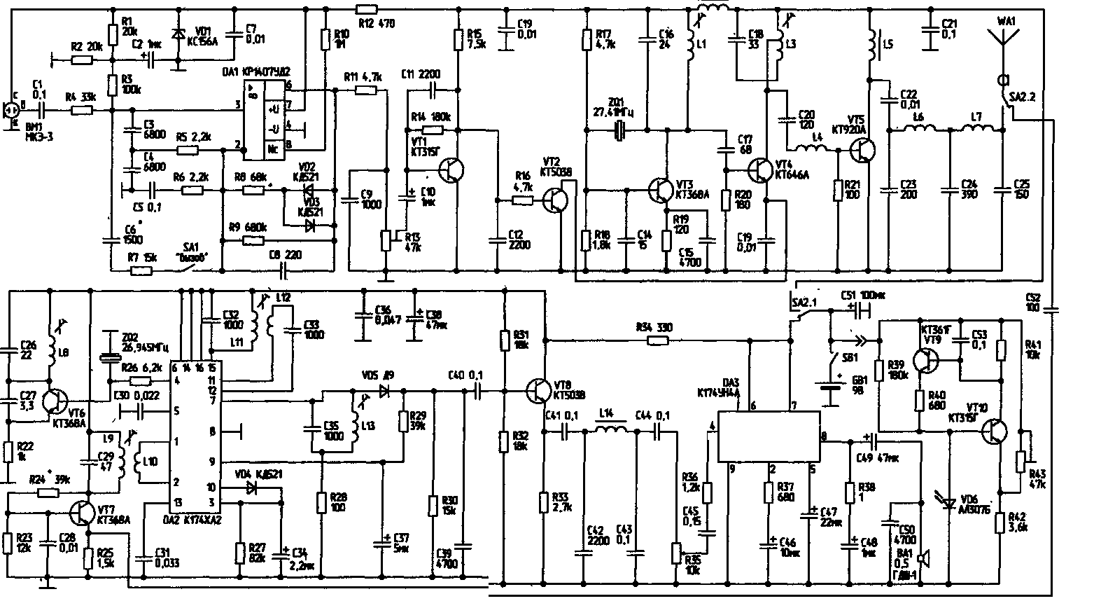 Приемная часть радиостанции выполнена на микросхеме К174ХА2 (DA2). Сигнал с антенны WA1 через кнопку SA2 2 поступает на входной усилитель на транзисторе VT7, нагрузкой которого служит контур L9,C29. С катушки связи L10 сигнал поступает на выводы 1,2 микросхемы DA2. Внешний гетеродин, стабилизированный кварцем ZQ2 с частотой 26,945 МГц, собран на транзисторе VT6. Сигнал гетеродина поступает на вывод 4 DA2. Сигнал промежуточной частоты (465 кГц) с выхода 7 микросхемы DA2 подается на детектор. Продетектированный сигнал, усиленный каскадом ни транзисторе VT8, через ФВЧ С42, L14, С43 поступает на регулятор громкости R35. Далее через цепь R36, С45 сигнал подается на УНЧ на микросхеме DA3 типа К174УН4А. С вывода 8 микросхемы DA3 сигнал поступает на динамическую головку ВА1 с сопротивлением обмотки 8 Ом. На транзисторах VT9 и VT10 выполнен индикатор разряда аккумуляторной батареи. При снижении напряжения питания до 6,5 В зажигается светодиод VD6. Порог срабатывания индикатора регулируется резистором R43.