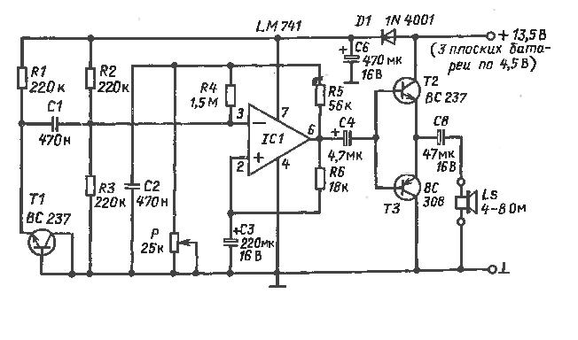 Некоторые шумы можно получить с помощью электронных усторойств. К ним относится также этот имитатор шума дизельного двигателя. Шипящий клокочущий шум возникает во время работы транзистра Т1 при обратном смещении его эмитерного перехода .Его модулирует генератор трапециидальных импульсов на мик-ме IC1,который предназначен для обеспечения медленных процессов.Частота повторения импульсов изменяется с помощью переменного резистора.LM 741 можно заменить на к140УД16,транзистор BC308 на КТ3107,BD237 на КТ817Г