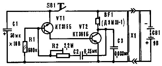 В устройстве можно использовать транзисторы серий КТ201, КТ301, КТ306, КТ312, КТ315, КТ316, КТ342 (VT1); КТ203, КТ208, КТ351, КТ352, КТ361 (VT2) со статическим коэффициентом передачи по току не менее 30. Резистор R1 любой малогабаритный, например МЛТ-0,125, подстроечный резистор - СПО-0,4, СП3-9а. Конденсаторы С2, С3 - МБМ (КЛС, К10-7В), С1-оксидный, например К50-6. Телефон BF1 - капсюль ДЭМШ-1, миниатюрный "наушник" ТМ-2А (в нем удаляют пластмассовую насадку - звуковод) или другой, но обязательно электромагнитный, с сопротивлением обмотки до 200 Ом; кнопка КМ1-1 или МП3.