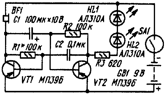 Транзисторы могут быть любые из серий МП39-МП42, но с коэффициентом передачи тока не менее 30. Резисторы - МЛТ-0,125, конденсатор С1 - К50-6, С2 - МБМ. Головной телефон - ТМ-2 или другой малогабаритный, сопротивлением 100... 200 Ом. Вместо указанных на схеме подойдут другие светодиоды. Яркость их свечения устанавливают подбором резистора R3. Источник питания - батарея "Крона", геркон - КЭМ-1.