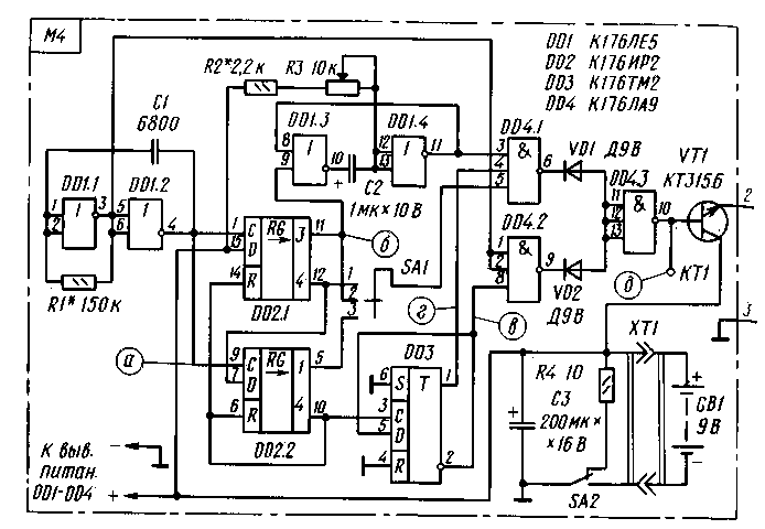 Его схема представлена на рис. 1. Предположим, что при включении напряжения питания движок переменного резистора R3 и подвижный контакт переключателя SA1 находятся в среднем положении. На инвертирующем выходе (вывод 2) триггера DD3 появляется высокий уровень (рис. 2,в), который разрешит прохождение на базу транзистора VT1 только импульса, поданного на объединенные два верхних по схеме входа элемента DD4.2.