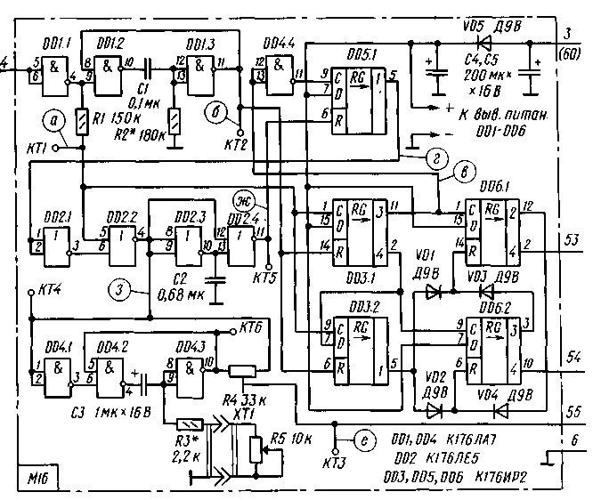 Затем на выходе инвертора DD1.1 появятся сигналы команды "Стоп", первый из которых снова запустит одновибратор DD1.2, DD1.3. Импульсы команды вызовут поочередное появление уровня 1 на выходах регистров DD3.1, DD3.2. Уровень 1 с выхода 3 регистра DD3.1 (рис. 4, в) вызовет появление высокого уровня на выходе 1 регистров DD5.1, DD6.1, тем самым даст разрешение на прохождение канального импульса через элемент DD2.2. Через время 5Т по фронту сигнала первого одновибратора (рис. 4,б) регистры DD3.1, DD3.2 установятся в исходное состояние.