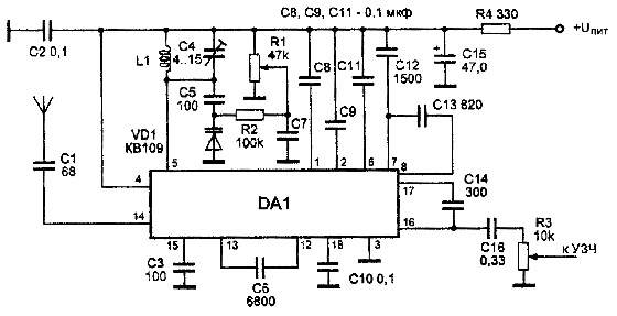 Сигнал с антенны поступает на УВЧ через конденсатор С1. Частоту настройки гетеродина определяют элементы L1, С4, С5, VD1. Настройка на станции осуществляется резистором R1, изменяющим напряжение на варикапе VD1 типа KB 109.