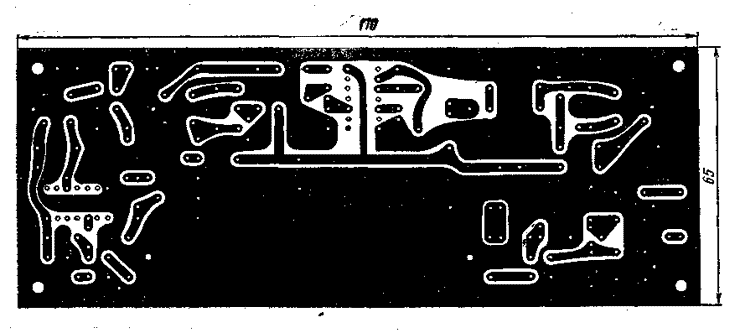 Напряжение на стоке транзистора VT3 должно изменяться от 2...5 В до 8,5 В при перемещении движка подстроечного резистора R8. Ток транзистора VT1 определяют, измерив напряжение на резисторе R3,— оно должно составлять 0,3...1 В, что соответствует току 0,8...2,5 мА. При недостаточном токе придется подать смещение на первый затвор, как описано выше, а при излишнем- увеличить сопротивление резистора R1. Работоспособность гетеродинов проверяют, присоединив щупы авометра к выводам конденсаторов С13 или С24. Напряжение на них должно составлять 5...7 В. Замыкание выводов катушек L3 и L6 должно вызывать уменьшение напряжения на 0,5...1,5 В, что укажет на наличие генерации. При отсутствии генерации следует искать неисправную деталь (обычно ей оказывается катушка индуктивности или транзистор). Все вышеописанные операции удобно выполнить до установки платы на шасси приемника. Конденсатор настройки С6 и регулятор громкости при этом можно не подключать. Дальнейшее налаживание сводится к настройке контуров приемника на нужные частоты. При этом желательно пользоваться хотя бы простейшим генератором стандартных сигналов (ГСС). Установив плату на шасси и выполнив недостающие соединения, подают (через конденсатор емкостью 20...1000 пФ) с ГСС на затвор транзистора VT3 немодулированный сигнал частотой 500 кГц. Контур ПЧ L4C17 настраивают по максимуму напряжения АРУ, которое измеряют авометром на конденсаторе С12. Амплитуду выходного сигнала ГСС следует поддерживать такой, чтобы напряжение АРУ не превышало 0,5...1 В. Регулятор усиления R8 при этом устанавливают в положение, при котором напряжение на стоке транзистора VT3 составляет 5...6 В. Второй . гетеродин подстраивают до получения биений — громкого свистящего звука в телефонах, подключенных к выходу усилителя 34. Контур L4C17 можно настроить и по максимальной громкости биений. Подав сигнал ГСС через тот же конденсатор связи на первый затвор транзистора VT1 (входной контур отключать не нужно), настраивают ГСС на среднюю частоту полосы пропускания ЭМФ и подбирают емкость конденсаторов С9 и С11 по максимуму напряжения АРУ или по максимальной громкости тона биений на выходе приемника. Одновременно подстроечником катушки L6 следует установить частоту второго гетеродина вблизи нижней граничной частоты полосы пропускания ЭМФ. Если использован фильтр ЭМФ-9Д-500-3.0В, а генератор перестраивается от частоты 500 кГц и выше, низкий тон биений должен появляться при частоте 500,3 кГц, затем тон должен повышаться и исчезать при частоте 503 кГц. В случае использования другого фильтра частоты настройки ГСС соответственно сдвинутся, но картина явлений останется прежней. Последний этап налаживания — настройка контуров первого гетеродина и входного фильтра. Подав с ГСС сигнал частотой 1880 кГц на гнездо XS2, настраивают на эту частоту приемник — вращением подстроечника катушки L3. Ротор конденсатора настройки С6 при этом должен находиться в среднем положении. Подстроечниками катушек L1 и L2 устанавливают максимальную громкость приема. В заключение измеряют диапазон перестройки приемника (он должен охватывать, весь любительский диапазон 160 м) и проверяют уменьшение чувствительности на краях диапазона. Если оно не превышает 1,4 раза, полоса пропускания входного фильтра достаточна. В противном случае для ее расширения несколько увеличивают емкость конденсатор