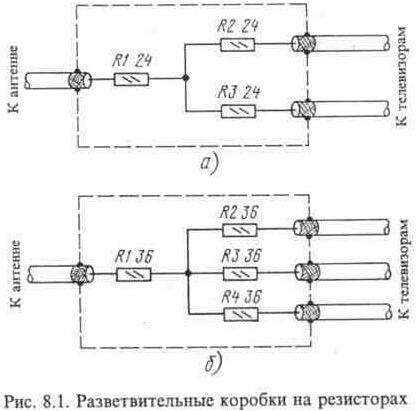 На рис. 8. 1, а приведена принципиальная схема разветвительной коробки на два отвода от абонентского кабеля коллективной антенны, а на рис. 8. 1, 6 - на три отвода. Коробка устанавливается в удобном месте квартиры, ее вход подключается к уже имеющемуся кабелю от разветвительной коробки коллективной антенны, а выходы соединяются телевизионными кабелями с телевизорами. К каждому выходу подключается один телевизор. Если по каким-то причинам к одному из выходов телевизор не будет подключен (например, его увезли на дачу или отправили в ремонт), к штекеру, предназначенному для подключения к антенному гнезду телевизора, нужно подключить резистор сопротивлением 75 Ом. В противном случае произойдет рассогласование, и изображения на экранах других телевизоров начнут двоиться. По этой же причине не следует делать в коробке лишние отводы, а если они имеются, к каждому из них нужно подключить резистор на 75 Ом. Как видно из схемы, коробка на два выхода содержит три резистора, коробка на три выхода - четыре резистора. Количество резисторов всегда будет на один больше числа выходов. Все резисторы в коробке, имеют одинаковое сопротивление, которое зависит от количества выходов и определяется по формуле: