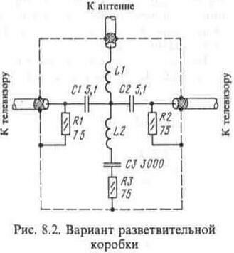В настоящее время нередко семья располагает двумя или несколькими телевизорами, каждый из которых необходимо подключить к наружной антенне. При наличии телевизионной антенны коллективного пользования проще всего сделать заказ на подключение второго или третьего абонентского отвода от стандартной разветвительной коробки, установленной на лестничной клетке. При этом исключается взаимное влияние между телевизорами, обеспечивается хорошее согласование входного сопротивления телевизионного приемника с фидером и не уменьшается уровень сигнала на входах телевизоров. Однако это требует значительного расхода коаксиального кабеля. Если же используется индивидуальная наружная антенна, то и разветвительная коробка отсутствует. Тем не менее, разветвительную коробку можно изготовить самостоятельно.