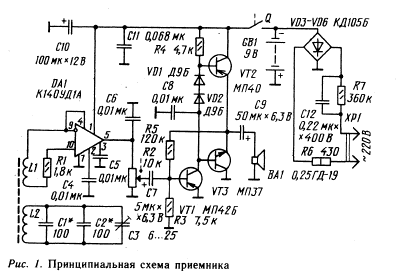 В радиолюбительской литературе приводилось немало описаний различных приемников прямого усиления, отличающихся простотой принципиальной схемы, с одной стороны, и вполне удовлетворительными техническими характеристиками — с другой. Использование в высокочастотной части приемника операционного усилителя позволяет уменьшить ее габариты и за счет этого несколько усложнить схему питания. Как правило, в приемниках подобного типа в качестве источника питания используется батарея «Крона». Однако эти батареи имеют малую емкость и дефицитны. В то же время широкое распространение получили аккумуляторные батареи 7Д-0, 1. Применение аккумуляторной батареи снимает проблему частой замены источника питания, но вынуждает использовать зарядное устройство, выполненное обычно в виде отдельного прибора. С учетом изложенного был сконструирован, изготовлен и испытан малогабаритный радиоприемник прямого усиления, рассчитанный на прием мощных радиостанций в диапазоне средних волн, показавший хорошие результаты. Особенностью этого приемника является использование в качестве усилителя высокой частоты и детектора одной микросхемы — операционного усилителя К140УД1А, а также размещение в одном корпусе с приемником зарядного устройства для аккумуляторной батареи типа 7Д-0, 1. Подключение зарядного устройства к электросети осуществляется без изъятия аккумуляторной батареи из корпуса с помощью встроенной сетевой вилки.