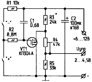 Принцип действия предлагаемого устройства заключается в плавной настройке при помощи двух кнопок - "+" и "-". При этом на выходе устройства плавно повышается или понижается напряжение настройки в пределах 2...4,5 В. При отпускании кнопок управления выбранное напряжение запоминается. Роль регулирующего элемента выполняет истоковый повторитель на транзисторе VT1. К его входу подключен запоминающий конденсатор С1. При включении питания конденсатор не заряжен, и напряжение на затворе полевого транзистора равно напряжению питания. На выходе напряжение равно максимальному значению, это соответствует началу УКВ-диапазона. Если нажать кнопку "+", запоминающий конденсатор С1 начнет заряжаться, транзистор VT1 постепенно открывается, в результате управляющее напряжение Uynp уменьшается. При нажатии кнопки "-" конденсатор С1 разряжается, и управляющее напряжение увеличивается.