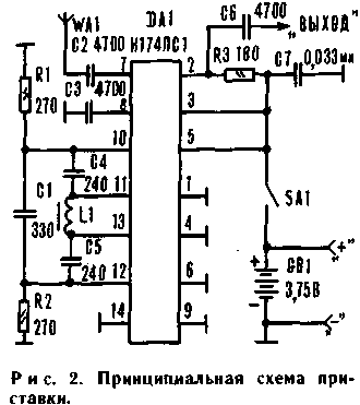 Входной сигнал с антенны WA1 через разделительный конденсатор С2 поступает на сигнальный вход микросхемы DA1, где происходит смешивание сигналов: входного и гетеродина. Преобразованный сигнал с нагрузки — резистора R3 — поступает через разделительный конденсатор С6 на антенну УКВ-радиоприемника. Конденсатор С7 устраняет самовозбуждение микросхемы при частичном разряде источника питания. |