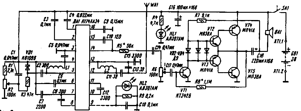 С антенны WA1 (ею служит плетеная ручка приемника из многожильного монтажного провода в изоляции) принимаемый сигнал поступает на широкополосный входной колебательный контур L2C11C13, рассчитанный на выбранный диапазон, а с контура - на вход микросхемы (выводы 12, 13). К другому входу микросхемы (выводы 4. 5) подключен контур гетеродина L1C2VD1. Изменением резонансной частоты этого контура настраивают приемник на нужную радиостанцию. Органом настройки в данном случае является варикап VD1. Его емкость изменяют электронным способом, подавая на варикап то или иное постоянное напряжение, снимаемое с движка переменного резистора R2. При этом частота настройки гетеродина превышает частоту сигнала принимаемой радиостанции на 75 кГц- значение промежуточной частоты.