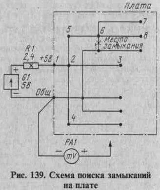 Нередко после завершения монтажа печатной платы обнаруживается замыкание между проводниками, которое трудно найти из-за разветвленности проводников. В разделе описывается эффективный способ поиска замыканий в платах, не требующий специального оборудования и пригодный для работы как с чистыми, так и со смонтированными платами.