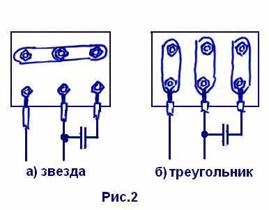 Если у вас эл.двигатель 380/220В, и в клеммной коробке он подключен в "звезду", Рис.2.а), то его следует переключить в "треугольник", Рис.2.б). При этом потеря мощности значительно уменьшится.